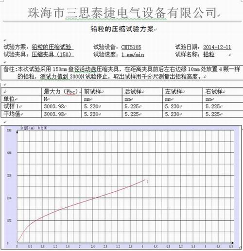 該客戶是一家專業(yè)生產(chǎn)汽車缸體密封墊等密封產(chǎn)品的企業(yè)。鉛粒是一種化學(xué)物質(zhì),質(zhì)重而軟,延展性好;易熔融、鑄造、滾壓和擠壓,能與許多金屬共熔為合金,立方晶體結(jié)構(gòu)。主要用途是用于測定錫的還原劑;使高鐵還原成亞鐵;用于銥與鉑和銣的分離,合金制造等!此次該客戶委托我司做的是鉛粒的壓縮試驗(yàn)方案,如下的相關(guān)試驗(yàn)數(shù)據(jù)及參數(shù)是用我們?nèi)继┙莸脑囼?yàn)機(jī)設(shè)備試驗(yàn)得出的結(jié)果:
