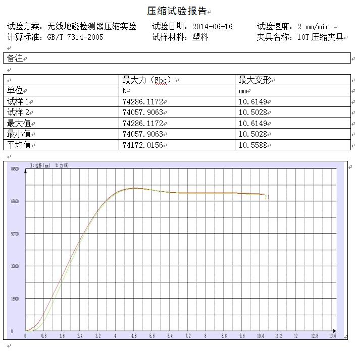 此次該客戶委托我司做的是無線地磁檢測器壓縮試驗,試驗得出的相關(guān)數(shù)據(jù):
